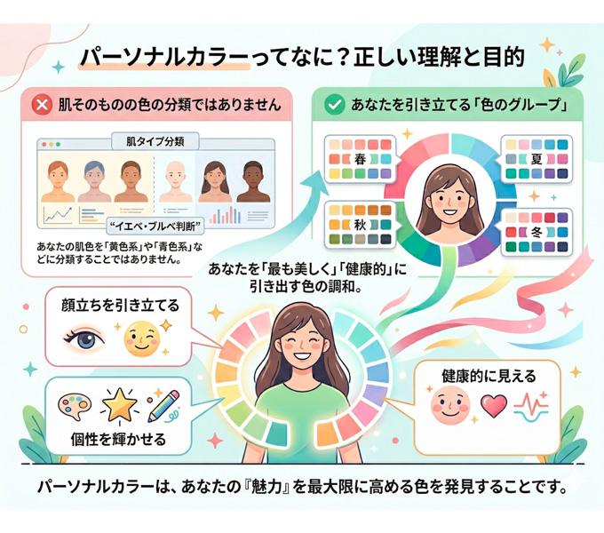 パーソナルカラーは、あなたの肌そのものの色を分類するものではなく、あなたの顔立ちや個性を最も美しく、健康的に引き立ててくれる色のグループを指すからです。